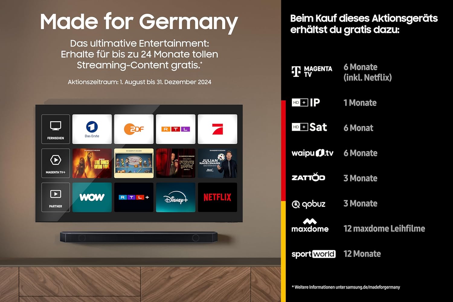 - Dolby Atmos und virtueller 3D-Surround-Sound mit OTS Lite für ein multidimensionales Sounderlebnis, Samsung Smart Hub und Gaming Hub für alle deine Lieblings-TV- und Gaming-Apps an einem Ort
